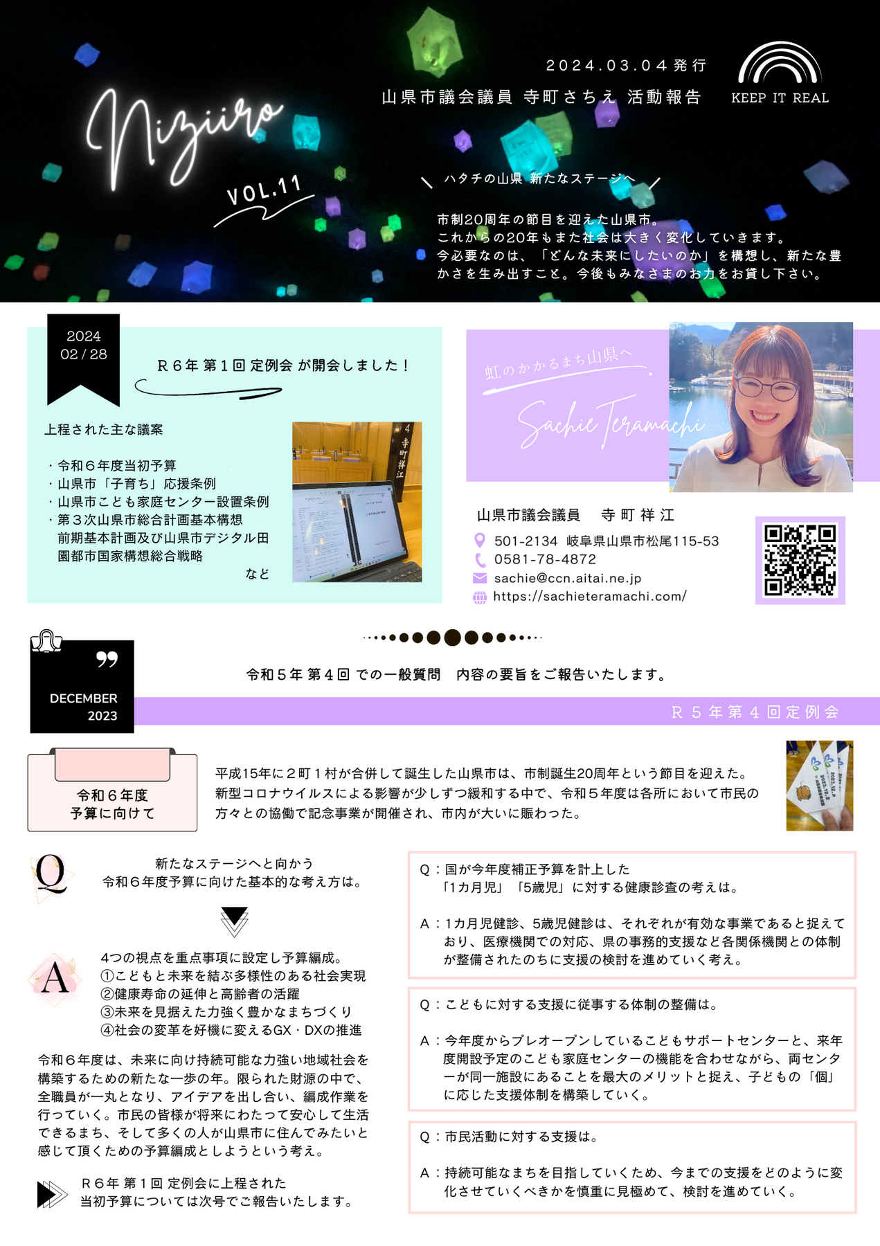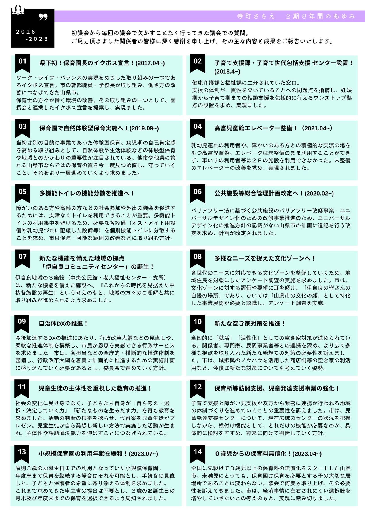 みなさまの思いを議会に届け、カタチにつなぐことが議員の役割。初議会から欠かさず行ってきた一般質問では、政策の実現や事業の前進、新たな課題の解決に繋げることができました。わたしたち議員には、論理的な根拠と軸をもった柔軟な思考で未来を切り開く力が必要です。多くの声に耳を傾け、多様な視点で問いを生み出し課題の解決へと繋げることを大切に、今後も活動を続けていきます。